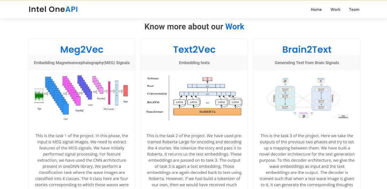 The project is divided into three portions: MEG2VEC, TEXT2VEC and BRAIN2TEXT. MEG2VEC corresponds to converting Magnetoencephalography (MEG) signals to a vectorized form. TEXT2VEC corresponds to converting text to vectorized form. BRAIN2TEXT corresponds to the mapping of MEG vectors to text vectors. To solve these three steps, we have used CNN from the oneDNN library for MEG2VEC, Roberta for TEXT2VEC and a novel decoder architecture for BRAIN2TEXT.